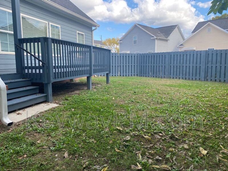 The fenced backyard with a wood deck
